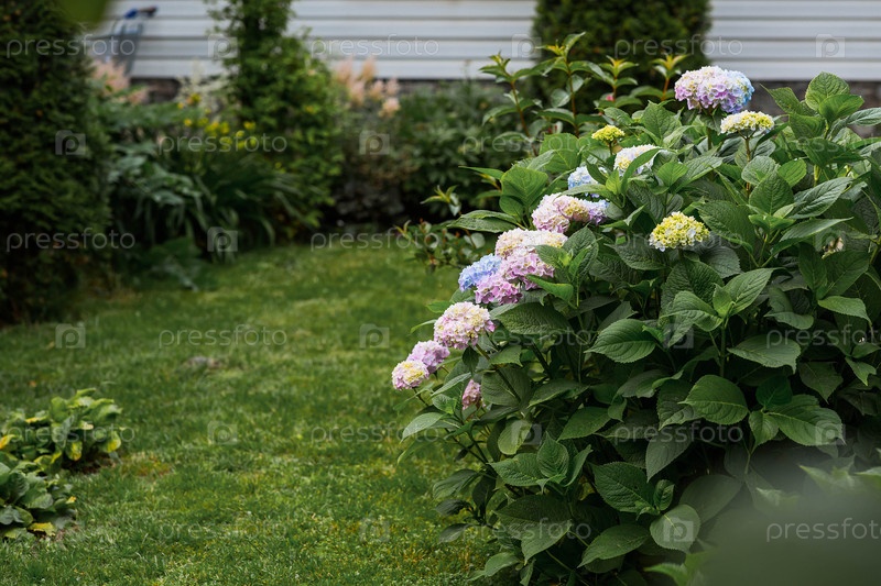 Гидрензия макрофилла (Macrophylla Hydrangea) Летний фон с цветами. Прекрасный пейзаж в природе с цветущими гидренциями. Красивые гидренции цветут в розовых и синих оттенках
