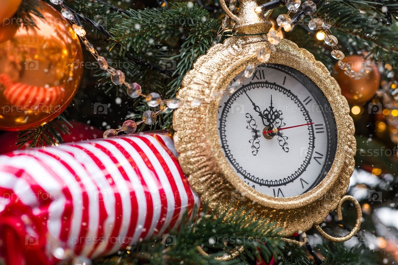 Часы на циферблатах показывают 12 часов. Золотые ретро-часы на рождественской елке. Красивый фон в канун Нового года или Рождества 2026
