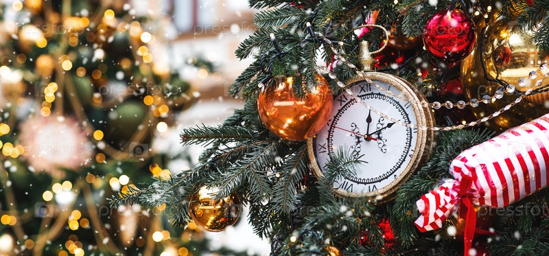 Часы на циферблатах показывают 12 часов. Золотые ретро-часы на рождественской елке. Красивый фон в канун Нового года или Рождества 2026