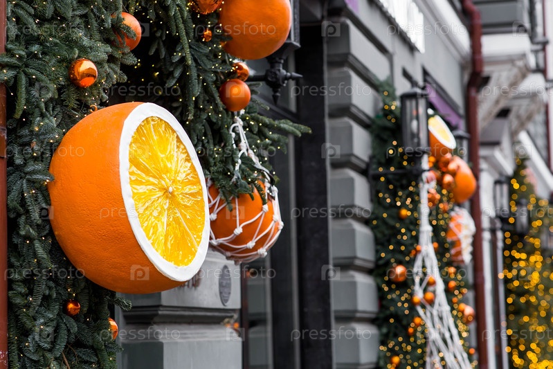 С Новым годом 2026. мандаринки в мешке с струнами и рождественские украшения на улицах Москвы. концепция подготовки ювелирных изделий к Рождеству