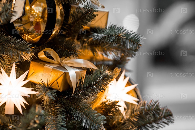 Рождественские игрушки и золотая коробка с подарками на рождественской елке в Москве.Концепция покупки и дарения подарков.Новогодняя открытка 2026