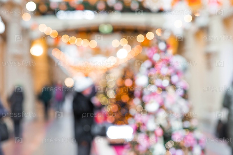 Абстрактный размытый рождественский фон с гирляндами на елке в теплых оттенках