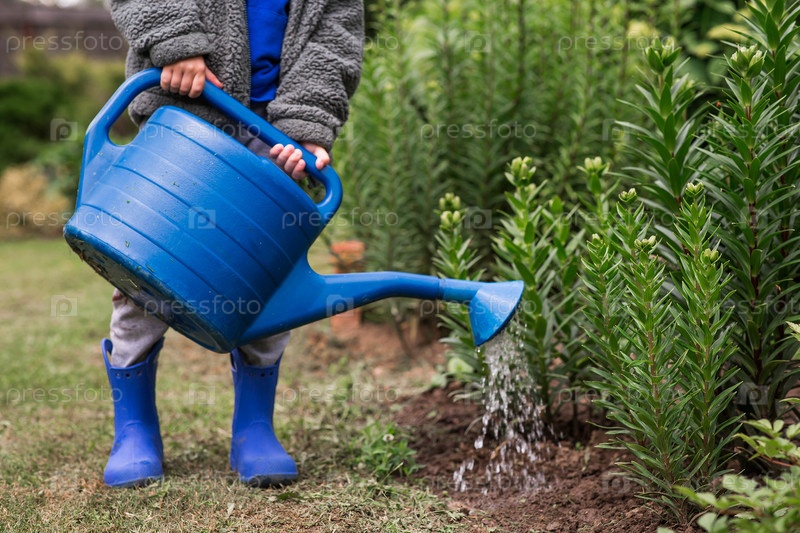 Красивый мальчик с голубой оросительной банкой поливает растения и цветы в открытом летнем саду