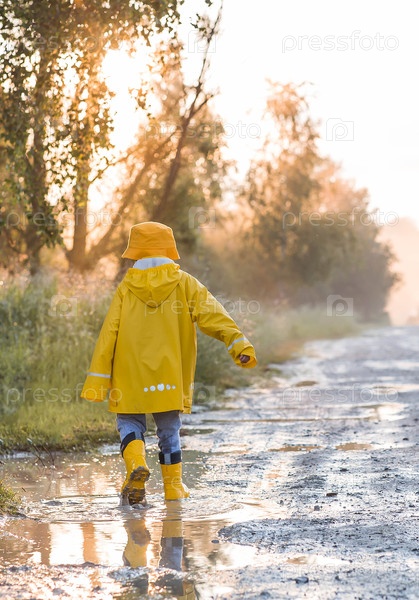 Мальчик в жёлтых резиновых ботинках и плаще бежит по лужам, веселится и играет после дождя. Лето-осенние каникулы. Счастливое детство
