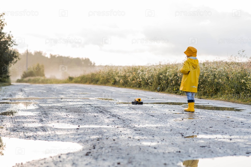 Мальчик в желтых резиновых ботинках и плаще бежит по лужам, веселится и играет с дистанционно управляемой машиной после дождя. летние и осенние каникулы. счастливое детство