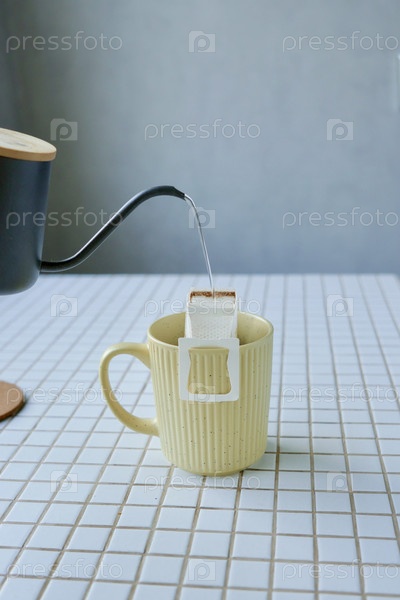 Желтая чашка свежеприготовленного кофе с удобным капельным фильтром на столе. сделать свежеприготовленный кофе
