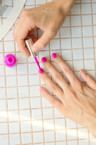 Женщина красит ногти дома, маникюр ухаживает за руками. ярко-розовый лак для ногтей