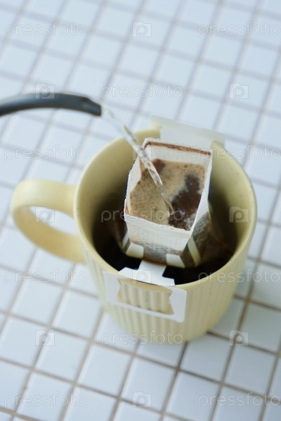 Желтая чашка свежеприготовленного кофе с удобным капельным фильтром на столе. сделать свежеприготовленный кофе