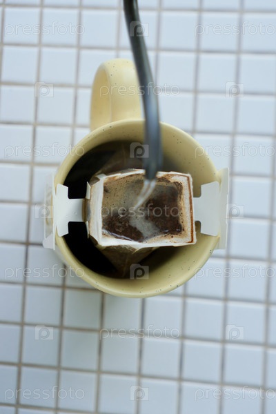 Желтая чашка свежеприготовленного кофе с удобным капельным фильтром на столе. сделать свежеприготовленный кофе