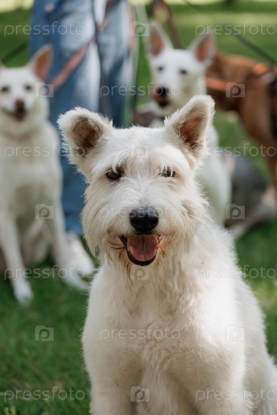 Белая собака в парке на прогулке с хозяином. гулять и тренировать домашних животных днем