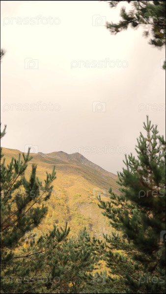 Вид на горы и холмы сквозь деревья и кустарники