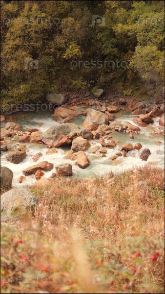 Вид на гору над рекой, синяя вода быстро течет вокруг больших скал и обрывов