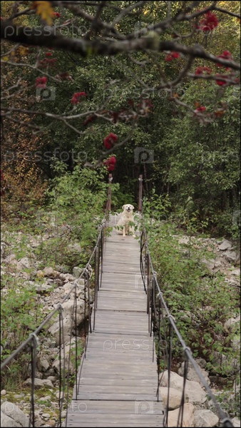Большая белая собака пересекает деревянный висячий мост через реку. походы в горах с домашним животным