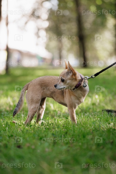 Чихуахуа, маленькая собака стоит на травяном поле с поводком