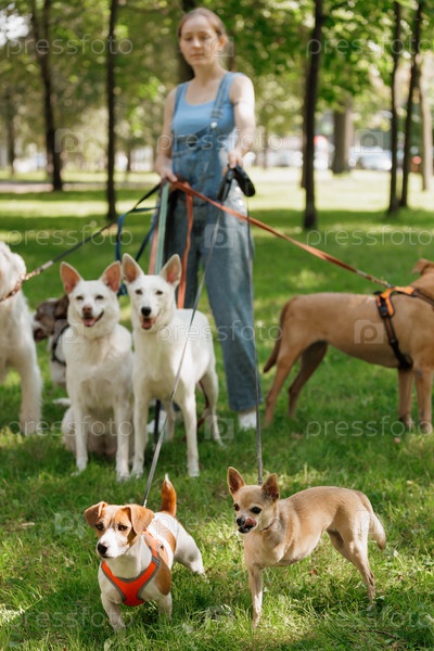 Профессиональный заводчик собак или няня выгуливает стадо милых собак разных пород