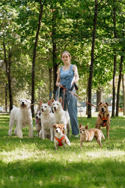 Профессиональный заводчик собак или няня выгуливает стадо милых собак разных пород