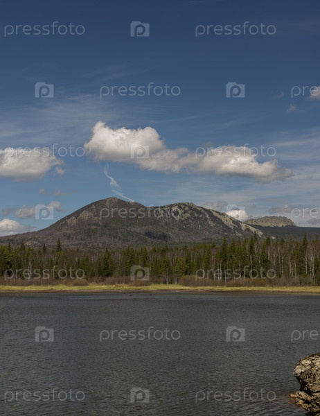 Природа России.Национальный парк Таганай.Лесной пейзаж.Горный хребет и лесное озеро на переднем плане