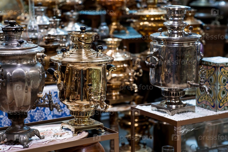 Древние красивые самовары в музее Самовара Туристический музейный дом и сувенирный магазин Россия, Коломна