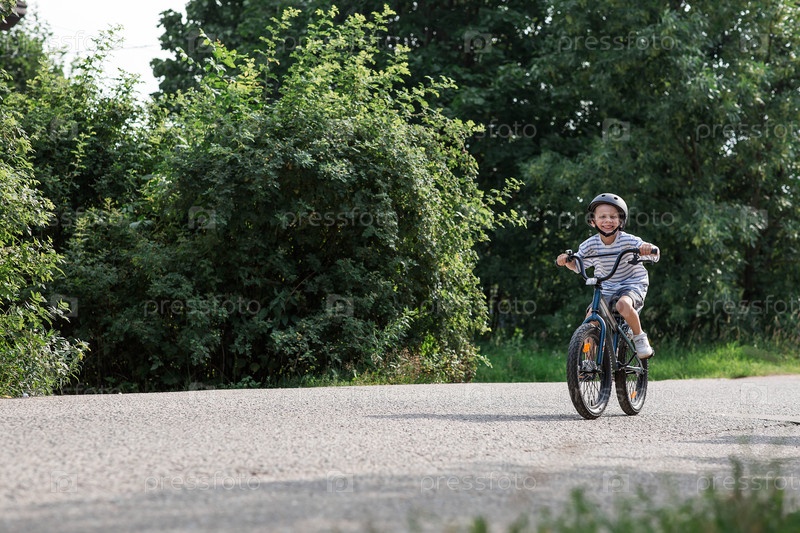 Красивый шестилетний мальчик едет на велосипеде в защитном шлеме снаружи. Счастливый ребенок занимается активным спортом. Защита. Страхование жизни и безопасность детей