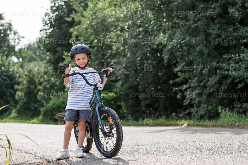 Красивый шестилетний мальчик едет на велосипеде в защитном шлеме снаружи. Счастливый ребенок занимается активным спортом. Защита. Страхование жизни и безопасность детей