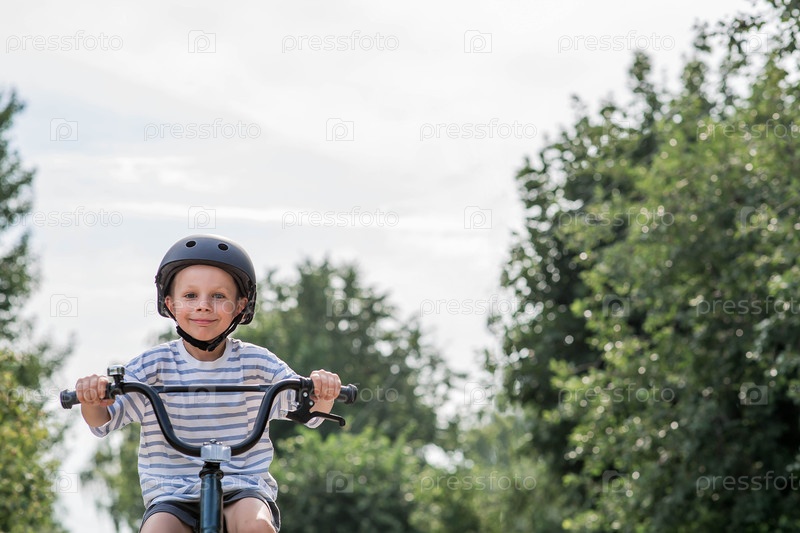 Красивый шестилетний мальчик едет на велосипеде в защитном шлеме снаружи. Счастливый ребенок занимается активным спортом. Защита. Страхование жизни и безопасность детей