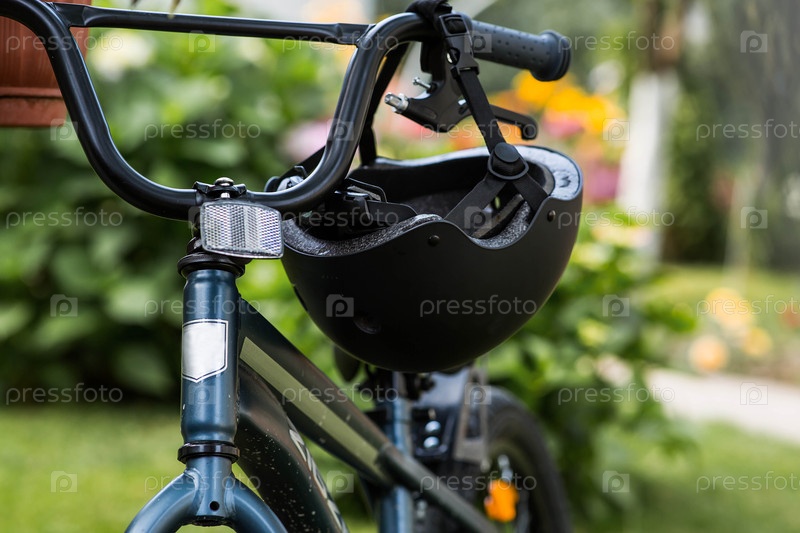Велосипед и защитный шлем на открытом воздухе. Активные виды спорта. Защита. Страхование жизни и безопасность детей