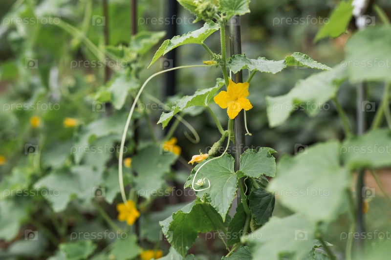 Культивирование огурцов. Стебли растений, зеленые листья и цветы. Садоводство и сбор урожая для здорового питания