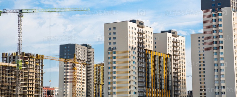 Современные жилые здания многоэтажных домов в солнечный день. Строительство новых жилых кварталов. Новые здания. Выдающийся, Ленинский район, Московская область