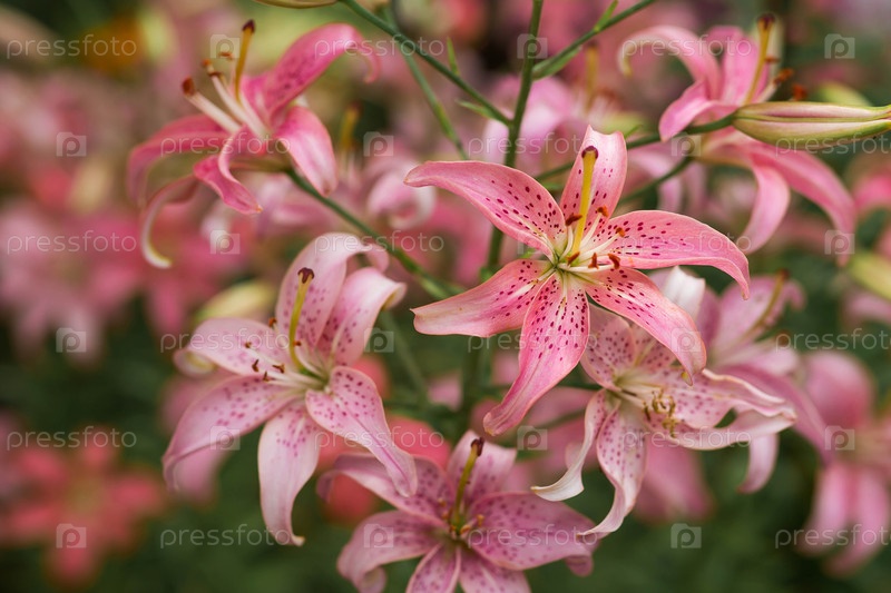 Красивая розовая, садовая, азиатская лилия, Морфо в солнечный день