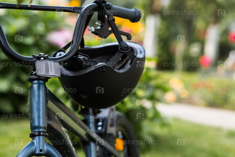 Велосипед и защитный шлем на открытом воздухе. Активные виды спорта. Защита. Страхование жизни и безопасность детей