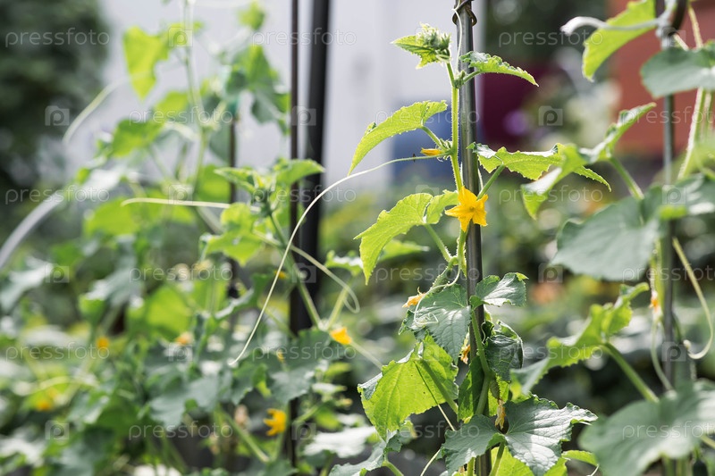 Культивирование огурцов. Стебли растений, зеленые листья и цветы. Садоводство и сбор урожая для здорового питания
