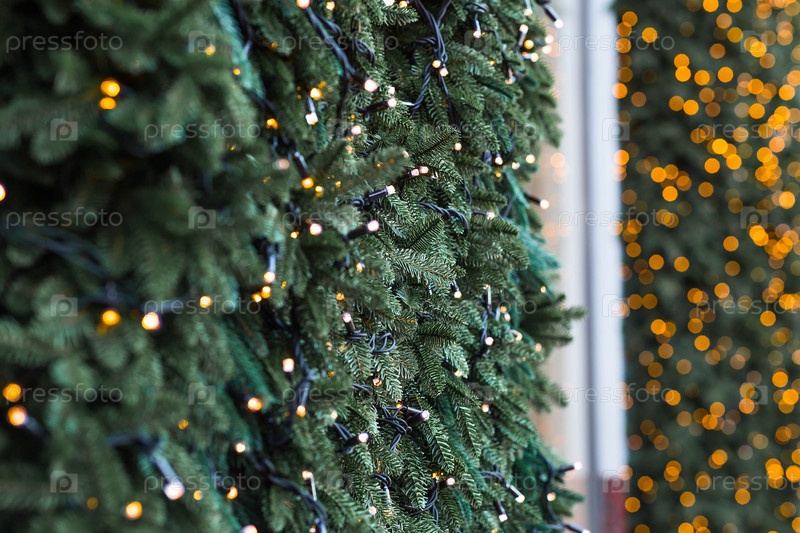 Светильники и огни на рождественской елке. Близкие. Красивый рождественский фон. Концепция декораций и украшений для нового 2026
