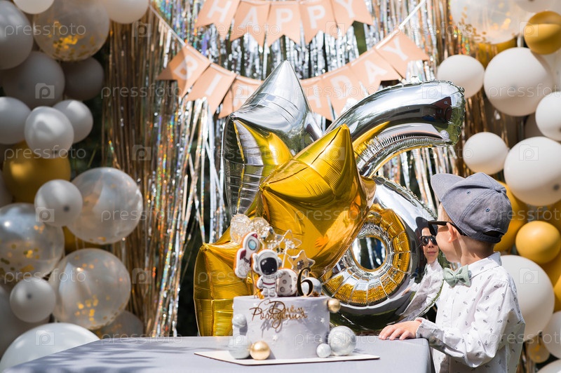 Стильный юбиляр с пирогом. Надпись на торте на русском языке: 'С днем рождения'. На заднем плане - воздушные шары и фотозона с дождем из фольги. Концепция детская вечеринка