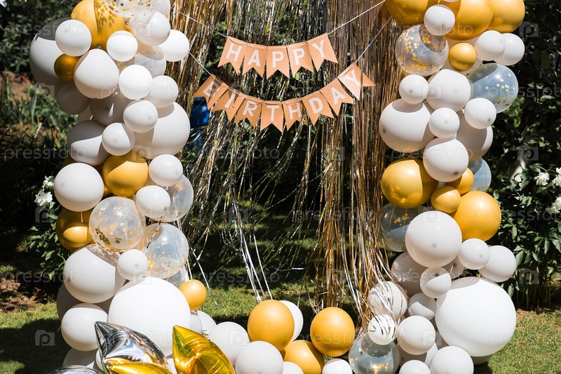 Надпись 'С Днём Рождения' на фотозоне из воздушных шаров и фольги дождя, праздничное место.Дневные украшения - шарики и гирлянда для детской вечеринки