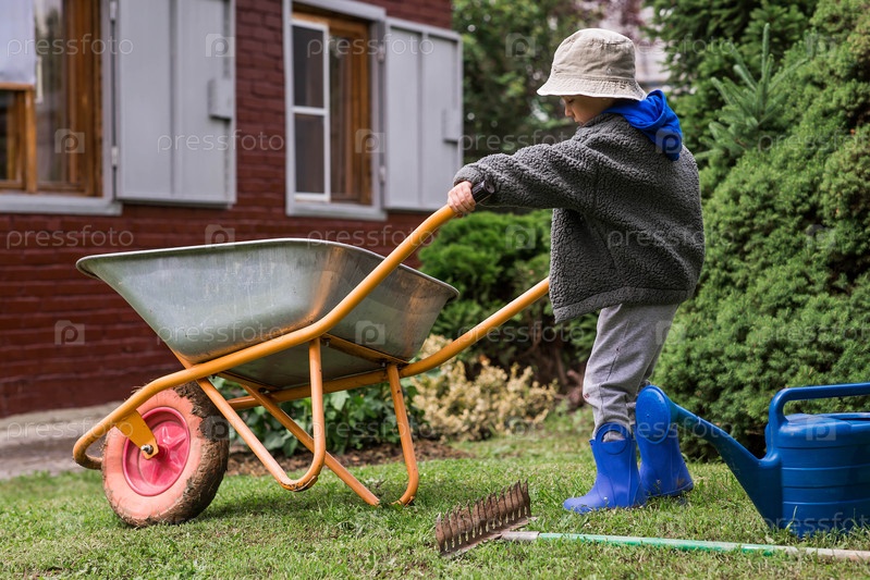Милый мальчик с садовым автомобилем на заднем дворе дома. Концепция огородничества, деревенской жизни и обучения ребенка работе. Подготовка сада к осени. Закрытие летнего сезона
