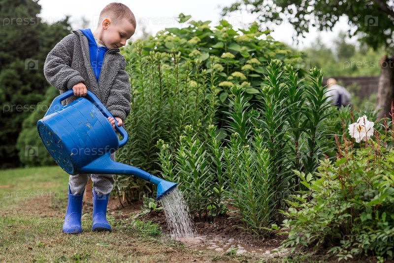 Красивый мальчик с голубой оросительной банкой поливает растения и цветы в открытом летнем саду