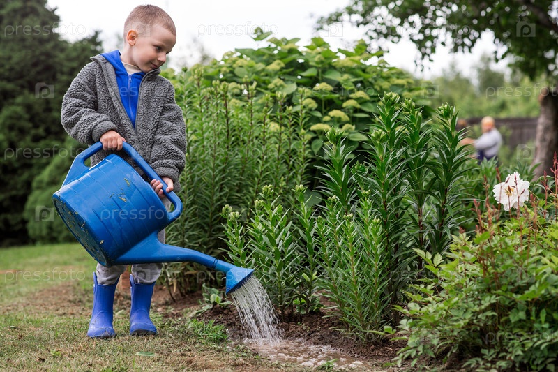 Красивый мальчик с голубой оросительной банкой поливает растения и цветы в открытом летнем саду
