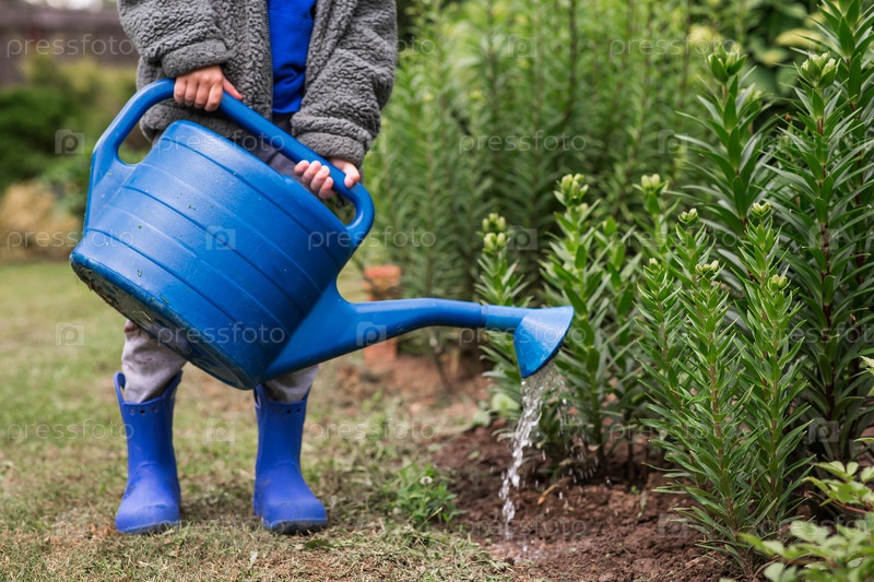 Красивый мальчик с голубой оросительной банкой поливает растения и цветы в открытом летнем саду