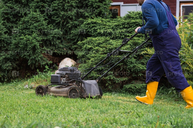 Мужчина-косилка косит траву на заднем дворе. Сельскохозяйственное оборудование для содержания сада. Концепция садоводства и деревенской жизни. Баннер