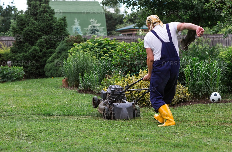 Мужчина-косилка косит траву на заднем дворе. Сельскохозяйственное оборудование для содержания сада. Концепция садоводства и деревенской жизни. Баннер