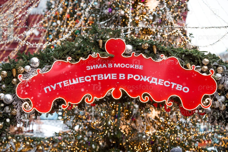 Новый год. Рождественские украшения на улицах Москвы. Новогодняя ярмарка на Красной площади. Надпись на красной доске на русском языке гласит 'Зима в Москве'