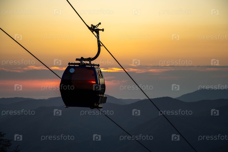 Кабельная дорога скользит над Красной Поляной, освещенная золотыми лучами заката солнца на потрясающем горном фоне