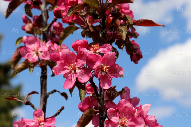 Розовые цветы на цветящем яблоне сорта Китака Красное мясо на фоне голубого неба в солнечный весенний день