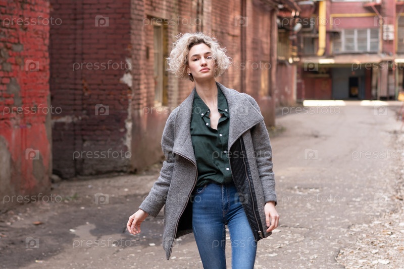 Красивая молодая женщина позирует снаружи в сером пальто