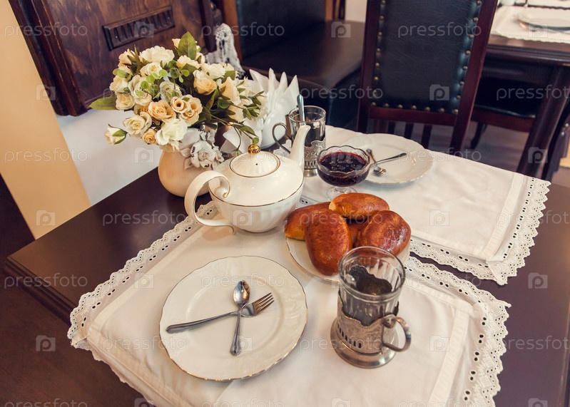 Установите стол для чая в ретро-стиле СССР с запеченными пирогами