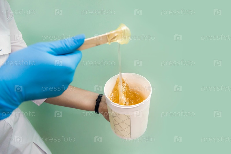 Косметолог держит банку сахарного воска, показывает текстуру пасты с помощью лапши