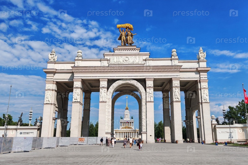 Москва, Россия - 10 июля 2025 года: арка главного входа во ВДНХ на фоне голубого неба