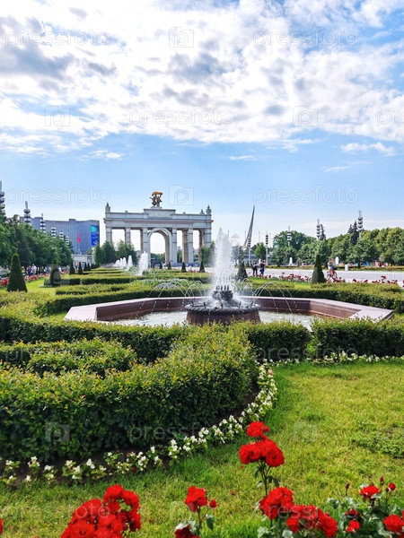Москва, Россия - 10 июля 2025 года: ландшафтный дизайн парка ВДНХ с фонтанами и видом на главный вход