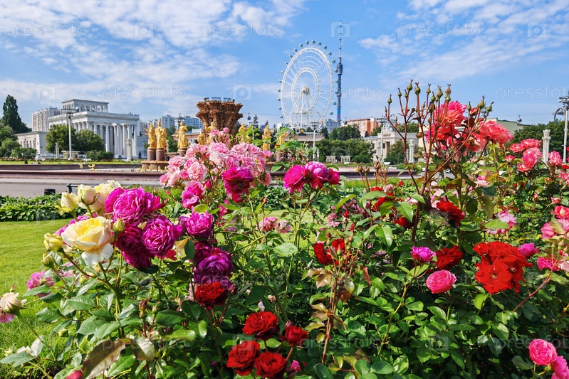 Москва, Россия - 10 июля 2025 года: Красивые кустарники цветущих роз в парке VDNKh