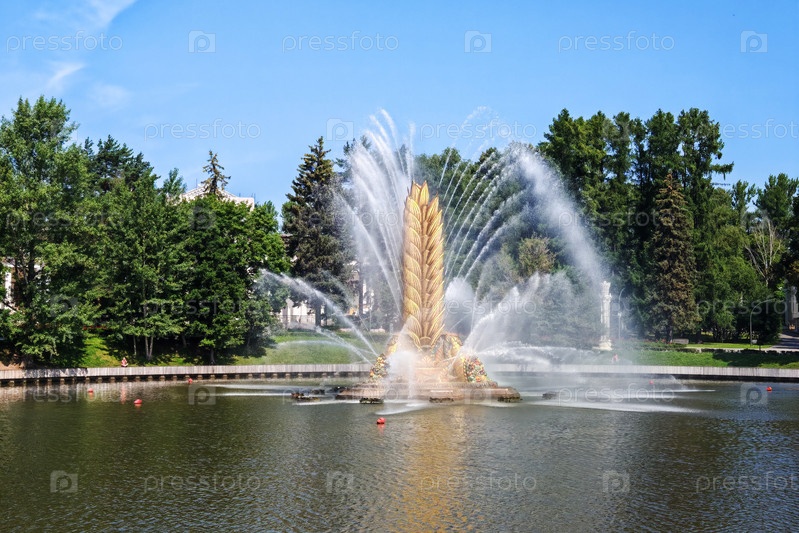 Москва, Россия - 10 июля 2025 года: фонтан 'Золотой шпиль' в парке ВДНХ